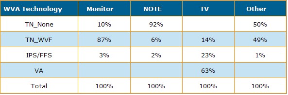 下表則表示了2010年第一季在不同的應用方面各種不同的視角技術的比重。基本上在Notebook 以及LCD Monitor的面板只有相當少的比重采取了高階的IPS或VA的技術,而在LCD TV的部份,VA型的出貨面積高達60%。