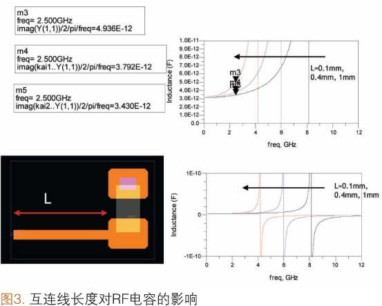 圖3是RF頻段下單個SMD焊盤的互連線長度對電容影響的簡單實例。在這種情況下,3.0pFSMD電容的一個電極連接在M2層上,形成接地電容。100.0μm寬的互連線與另一個電極連接在一起。在2.5GHz頻段下,1.0mm長的互連線可使SMD電容器的等效電容增長到4.9pF(增大了63%)。當(dāng)然,互連線越短,等效電容與本征電容(3.0pF)的值就越接近。然而,通常使用長互連線連接SMD元件是不可避免的。在這種情況下,考慮互連線對電容的影響就顯得異常重要(有時把這種方法稱為對電容的微調(diào)),否則SiP將無法正常工作。