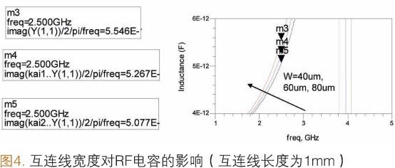 [page]除互連線長度之外,互連線的寬度也會對RF電容產(chǎn)生影響。在襯底的制作過程中,線寬通常會發(fā)生變化(舉例來說,與設(shè)計寬度相比,實際線寬的變化范圍為±10.0μm~±15.0μm)。如圖4所示,如果設(shè)計的互連線為1.0mm長,60.0μm寬,實際卻達(dá)到40.0μm寬,在2.5GHz下等效電容變化將達(dá)到5.3%(以3.0pF接地SMD電容為例)。如果把這種SMD電容用于濾波器中,對于RF應(yīng)用來說,電容值5.3%的變化將導(dǎo)致約2.7%的頻移。我們必須對RF應(yīng)用中含有SMD電容的RFSiP模塊的襯底制造容差進(jìn)行細(xì)致研究。