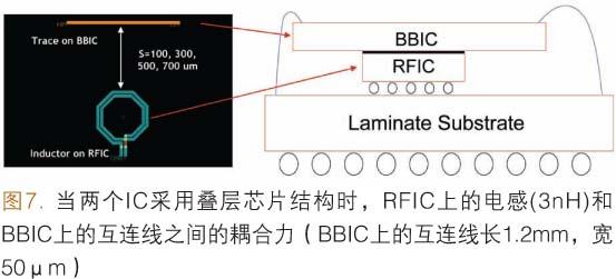 圖7給出了BBIC和RFIC采用SiP(為簡單起見,實例中未表示SMD元件)疊層芯片結(jié)構(gòu)的實例。在這個實例中未使用金屬屏蔽層,使用環(huán)氧芯片粘接材料把BBIC直接堆疊在RFIC上。就像前文提到的那樣,BBIC中的主時鐘信號(20.0MHz或40.0MHz)包含一些高頻成分,落在RF芯片通帶的范圍內(nèi)。如果BBIC中時鐘互連線和RF芯片之間沒有保持足夠的隔離,特別是在VCO電感中,主時鐘信號可能使RF電路產(chǎn)生噪聲,降低RF芯片的選擇性。