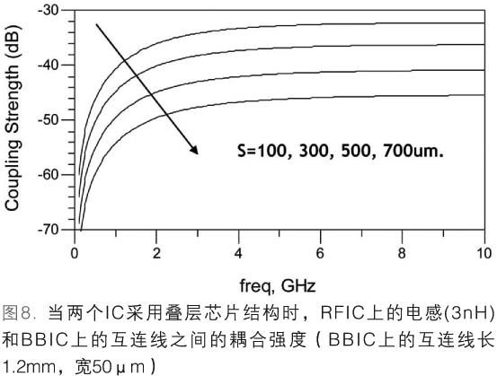 圖8表示了BBIC和RFIC電感之間的耦合強(qiáng)度(未使用隔離層)。假設(shè)BBIC和RFIC的厚度為250.0μm時,對VCO電路中的3nH電感進(jìn)行了研究。BBIC中主時鐘的互連線設(shè)置為1.2mm長。根據(jù)模擬結(jié)果,當(dāng)橫向距離(S)為100.0μm時,2.5GHz下的隔離為-35dB。這一隔離值對大多數(shù)RF應(yīng)用來說是不夠的。當(dāng)橫向距離為700.0μm時,隔離值提高為-50dB,這個值對大多數(shù)RF應(yīng)用來說仍然不夠。為保證VCO電感的性能,位于BBIC電感上方的主時鐘不能使用長互連線。根據(jù)以上分析,我們還應(yīng)對RFSiP使用的疊層芯片法做進(jìn)一步研究,從而判斷BBIC和RFIC器件之間出現(xiàn)嚴(yán)重相互干擾的可能性。