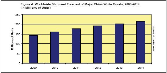 圖4所示為iSuppli公司對2009-2014年中國白色家電市場三種主要產(chǎn)品的出貨量預(yù)測。