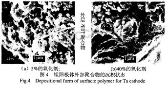 對于二步法生產工藝,單體為聚合反應過程中的過量一方,聚合物生成的量由氧化劑的量來決定,聚合物在鉭芯表面的沉積數量隨氧化劑含量的增加而增加。從圖3可以看出,在相同的浸漬次數下,使用含量為5%的氧化劑陽極塊的質量增加為0.54%,而使用含量為40%的氧化劑陽極塊質量增加為3.52%,因此高含量的氧化劑可以有效增加聚合物的沉積量。