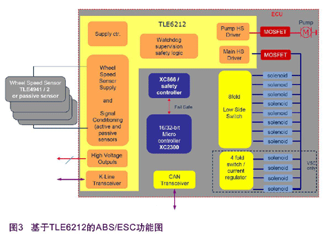 目前ABS/ESC系統正經歷著快速發展階段,比如輪速傳感器正從被動式傳感器向主動式傳感器轉換,使用功能更強大的微控制器,在系統中加入備份微控制器等等。從性能上說,上述的方案完全滿足了ABS/ESC對主控單元的要求。但是,隨著汽車工業的快速發展,對汽車的可靠性和輕量化的要求也在不斷地提高。此外,幾乎所有的廠商都面臨著削減成本的壓力。上述方案由于采用全分立式器件設計,所以器件的數目較多,從整個系統來看成本較高且主控單元有存在故障的可能性。另外,整個主控單元的體積可能較大。