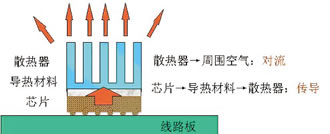 由于散熱器底面與芯片表面之間會存在很多溝壑或空隙,其中都是空氣。由于空氣是熱的不良導體,所以空氣間隙會嚴重影響散熱效率,使散熱器的性能大打折扣,甚至無法發揮作用。為了減小芯片和散熱器之間的空隙,增大接觸面積,必須使用導熱性能好的導熱材料來填充,如導熱膠帶、導熱墊片、導熱硅酯、導熱黏合劑、相轉變材料等。如圖2所示,芯片發出的熱量通過導熱材料傳遞給散熱器,再通過風扇的高速轉動將絕大部分熱量通過對流(強制對流和自然對流)的方式帶走到周圍的空氣中,強制將熱量排除,這樣就形成了從芯片,然后通過散熱器和導熱材料,到周圍空氣的散熱通路。