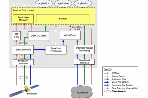 通過寬帶通道(BroadbandInterface),雙模終端能夠連接到互聯網或其它的IP網絡。它提供了應用數據接收的第二個通道,以便與應用提供商的服務器連接。這個連接用于接收非線性音視頻內容(如內容點播業務)。互聯網協議處理器(InternetProtocolProcessing)組件包含了處理來源于互聯網等IP網絡數據的功能,通過這個組件,應用數據提供給運行環境,非線性音視頻內容傳送到媒體播放器(MediaPlayer),包含在應用中解析、呈現與播放。