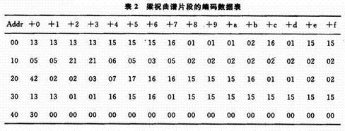 設音符的6位二進制編碼中,最高位為間斷音控制,中間2位為音程碼,最低3位為音名碼。每個8分音存放于1個存儲單元,四分音符碼占2個存儲單元。若音名碼用其簡譜數符對應的二進制碼表示,而低、中、高三個音程分別用"01”,“00",“10”三組碼表示,“11”為結束符碼,則圖3曲譜碼存儲表如表2所示。表中6位二進制音符碼用2位八進制數表示。