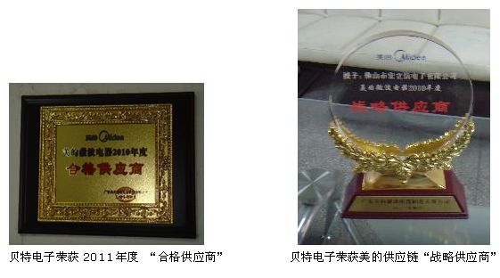 與美的合作近8年來,貝特電子有限公司憑借過硬的產(chǎn)品質(zhì)量,極強的研發(fā)能力,優(yōu)質(zhì)的售前售后服務,成功獲得“合格供應商”及“戰(zhàn)略供應商”兩項大獎,并得到獎金3萬元。