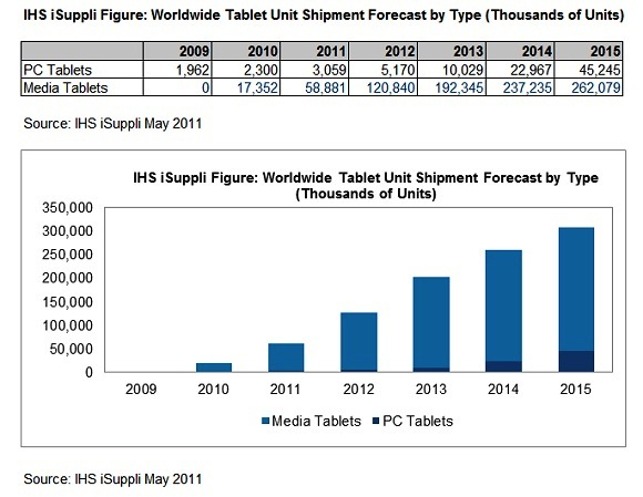IHS iSuppli估計,在2010年到2015年間,多媒體平板計算機的總出貨量將達到8.887億臺,但同期間PC型平板計算機的出貨量僅有8,880萬臺;在2015年,PC型平板計算機總出貨量預測為4,520萬臺,該數字在2010年為230萬臺,期間平均年復合成長率(CAGR)為81.5%。但在多媒體平板計算機部分,出貨量在2010年為1,740萬臺,2015年將達到2.621億臺,期間CAGR為17.4%。