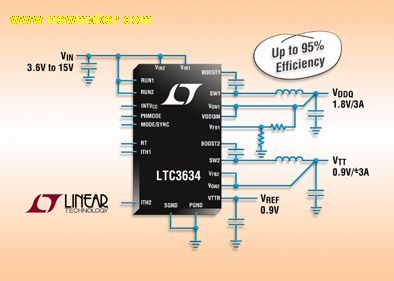 凌力爾特公司 (Linear Technology Corporation) 推出高效率、雙通道單片同步降壓型穩(wěn)壓器LTC3634,該器件為DDR1、DDR2和DDR3 SDRAM控制器提供電源和總線終端軌。LTC3634 在3.6V至15V的輸入電壓范圍內(nèi)工作,從而非常適用于雙節(jié)鋰離子電池應(yīng)用以及5V和12V中間總線系統(tǒng)。LTC3634采用獨(dú)特的恒定頻率/受控接通時(shí)間、電流模式架構(gòu),這種架構(gòu)非常適用于從一個(gè)12V輸入電源以高開(kāi)關(guān)頻率給DDR應(yīng)用供電。其終端電壓VTT設(shè)定為VDDQ的1/2,可低至0.6V,準(zhǔn)確度為±1.6%。單片設(shè)計(jì)和高達(dá)4MHz的開(kāi)關(guān)頻率相結(jié)合,允許使用纖巧、低成本電容器和電感器,可為DDR電源應(yīng)用提供一種非常緊湊和高效率的解決方案。