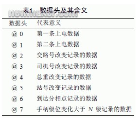 該裝置采用了大容量的存儲器。由于機車運行的數(shù)據(jù)較多,為了降低GPRS 的使用成本,對于所有采集的信息均采用非分區(qū)定長壓縮方法[2]存儲,每包數(shù)據(jù)定長35 個字節(jié),由數(shù)據(jù)頭、公共數(shù)據(jù)、數(shù)據(jù)幀標(biāo)識、數(shù)據(jù)校驗位等4 部分組成。數(shù)據(jù)頭占一個字節(jié),公共數(shù)據(jù)占32 個字節(jié),數(shù)據(jù)幀標(biāo)識和校驗結(jié)果各占一個字節(jié)。由于每包數(shù)據(jù)只有35 個字節(jié),不能包含所有的機車運行信息,因此在上電的時候?qū)⑼暾囊粭l機車運行信息拆分成兩包發(fā)送。另外,@7 代表的級位變化大小N 的值可以在程序中設(shè)定。數(shù)據(jù)頭及其具體含義如表1 所示。