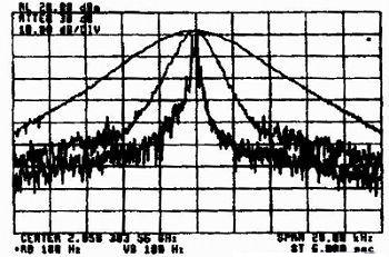 圖2是不同分辨率帶寬頻譜的顯示,可以看到分辨率帶寬RBW=10 kHz時不能辨別出載波形狀,分辨率帶寬RBW=1 kHz時可以清楚地辨別出載波形狀。