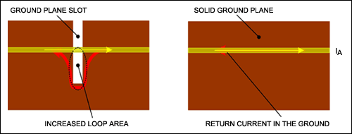 返回電流通路須盡可能靠近主電流通道,將輻射磁場降至最小。這種布局有助于減小電流環(huán)路面積。返回電流的理想低阻通路通常是引線下方的接地區(qū)域—將環(huán)路面積有效限制在電介質厚度乘以引線長度的區(qū)域。但是,如果接地區(qū)域被分割開,則會增大環(huán)路面積(圖3)。對于穿過分割區(qū)域的引線,返回電流將被強制通過高阻通路,大大提高了電流環(huán)路面積。這種布局還使電路引線更容易受互感的影響。
