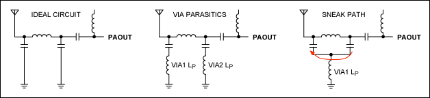 寄生電感往往對旁路電容的連接影響很大。理想的旁路電容在電源層與地層之間提供高頻短路,但是,非理想過孔則會影響地層和電源層之間的低感通路。典型的PCB過孔(d = 10 mil、h = 62.5 mil)大約等效于一個1.34nH電感。給定ISM-RF產品的特定工作頻率,過孔會對敏感電路(例如,諧振槽路、濾波器以及匹配網(wǎng)絡等)造成不良影響。