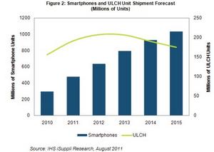 下圖所示為2010-2015年智能手機(jī)與ULCH單位出貨量預(yù)測(cè)。