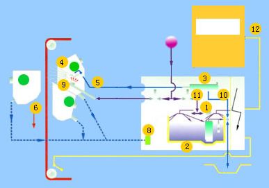 其工藝過(guò)程如圖3所示,泵①抽取液槽②的液體或水,通過(guò)過(guò)濾器③輸送到噴盤架⑤上各種噴盤④中;當(dāng)平幅運(yùn)行的織物⑥通過(guò)時(shí),液體便噴射其上;末被噴射到織物上的液體則通過(guò)回流管⑦流回到液槽;通過(guò)預(yù)過(guò)濾器⑧清除回流液體中的雜質(zhì);清洗裝置⑨⑩⑾保證了供液體單元的清洗,控制單元⑿控制整個(gè)裝置。