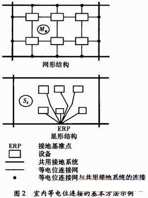 當室內等電位采用網形連接時,等電位連接帶宜每隔≤5 m與建筑物內主鋼筋連接。當建筑物無鋼筋或建筑物內鋼筋截面達不到地網要求時,網形等電位連接帶應有不少于兩處與人工地網可靠連接。