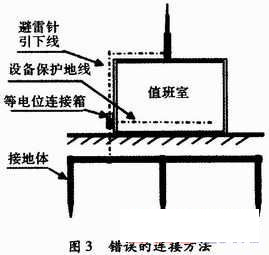 目前,關于共用接地有一種誤解,認為將設備的接地引線無論怎樣連接,最終只要接在同一個接地體上就算是共用接地,如圖3所示。將“共引線”也誤認為是“共地”。其實不然,所謂“共用接地”就是把許多不同性質的接地裝置如電氣安全接地、交流電源工作地、通信及計算機直流地等匯集于一個等電位連接箱,使之成為一個等電位體,然后直接與接地體連接,而防雷地則通過另一條引下線與接地體連接。而不是將室內設備接地與室外防直擊雷接地通過同一根引下線與地相連。更不允許將室內接地引線與室外防直擊雷引線匯集與一個所謂的等電位連接箱,然后再與接地體相連。室內接地引線要遠離室外防雷引下線,如圖4所示。否則,遇雷擊時,強大的雷電流在通過引線向大地泄放的同時,室內引線及所有設備上瞬間便會產生很高的電位差,設備難免遭到破壞。另外,假設與接地體相連的引線因銹蝕斷開或等電位連接端子接觸不良,一旦發生雷擊,強大的雷電流便會直擊至值班室設備上,這是非常危險的。