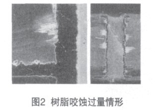 可見,產生CAF必須具備下列五種條件:裸露的銅導體、水氣、電解質、電位差和通道。前四項在電子產品的使用中不可避免。通道是唯一可控制產生CAF的途徑,而通道的形成主要與印制板的生產過程中材料、鉆孔、去沾污等因素相關。一般地來說材料的玻纖越細,樹脂含量越高,韌性越好,鉆孔撕裂的機率較低,因此,對于高密度的印制板或潮濕環境中使用的印制板盡可能采用細玻纖的材料。不同的材質的鉆頭,不同鉆孔數量,不同的鉆孔參數,鉆孔時,鉆頭對增強材料的沖擊不同,孔壁質量的差異較大,對孔壁的損傷也不盡一致,芯吸程度不一。因此,為了杜絕通道的發生,應當嚴格控制鉆孔質量,確??妆诠饣秸?。去沾污主要目的是去除內層導體鉆孔時吸附樹脂,當然,也咬蝕孔壁絕緣層中的樹脂,有時為了形成負凹蝕,孔壁絕緣層樹脂甚至咬蝕更多。這時,咬蝕量需嚴格控制。否則,極易形成“通道” 。如下圖樹脂咬蝕過量情形。
