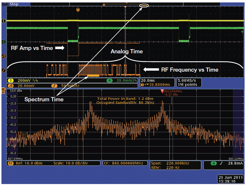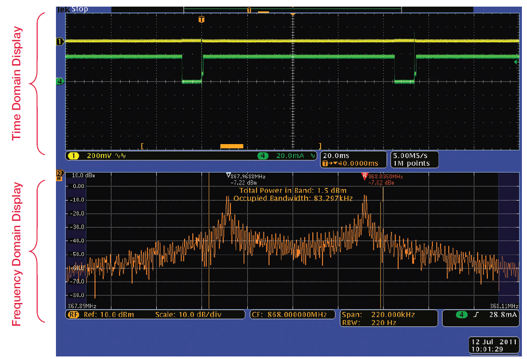 畫面的下半部分顯示了RF信號的頻域視圖,在本例中是無線電發(fā)射機輸出,畫面的上半部分是時域的傳統(tǒng)示波器視圖。頻域視圖中顯示的頻譜來自時域視圖中短橙色條指明的時間周期,稱為頻譜時間(Spectrum Time)。