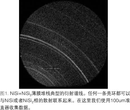 第一代應(yīng)用于多晶材料的XRD量測(cè)設(shè)備由HyperNex Inc和IBM共同研發(fā),并安裝在IBM位于紐約East Fishkill的半導(dǎo)體研發(fā)生產(chǎn)工廠。該設(shè)備的硬件設(shè)計(jì)極具針對(duì)性,它包括固定的放射源和探測(cè)器,可以在xy水平方向移動(dòng),在方位角方向旋轉(zhuǎn)的水平采樣載物臺(tái)。水平載物臺(tái)需要與硅片的傳送機(jī)械臂兼容,而xy傳送載物臺(tái)允許全硅片映射,它的重要性在隨后的章節(jié)中會(huì)變得顯而易見。X射線束使用可變的縫狀源,從而使得光束采樣可以覆蓋從50um到1mm的范圍。寬光束用來(lái)掃描無(wú)圖形的硅片,窄光束用來(lái)獲得有圖形硅片上獨(dú)立結(jié)構(gòu)的衍射譜線。描述獨(dú)立結(jié)構(gòu)特性的需求決定了系統(tǒng)必須具備視頻顯微鏡和圖形識(shí)別軟件。為了滿足高速產(chǎn)出的需要,二維場(chǎng)探測(cè)儀被用來(lái)收集衍射譜線。圖1說(shuō)明了一幅探測(cè)儀收集到的衍射譜線。將場(chǎng)探測(cè)儀收集的圖形組合起來(lái)便是傳統(tǒng)的衍射圖形(圖2),它可以用作相鑒定和多相薄膜中相數(shù)的量化,圖形中根據(jù)環(huán)強(qiáng)度的變化可以獲得該材料晶體織構(gòu)的信息,環(huán)的寬度決定了相關(guān)晶粒的大小。