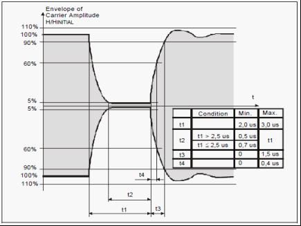 13.56MHz高頻RFID系統是目前國內應用最為廣泛,技術較為成熟的射頻識別系統。相關的國際標準對射頻發射頻率、信道帶寬、發射功率等參數都有明確的要求,特別是RF信號的幅度(功率)隨時間變化的情況,標準有著嚴格的規定。以讀寫設備為例,讀寫設備發出的載波信號的幅度變化時間,必須符合ISO18000-3標準對于t1-t4的時間限制。
