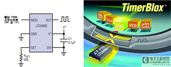 凌力爾特公司最近推出了一個基于硅振蕩器的定時器件新系列,即 TimerBloxTM 系列。這些器件含有智能電路,可提供 5 種基本定時功能:電壓控制振蕩器 (VCO)、面向長持續時間定時的非常低頻率時鐘、脈沖寬度調制振蕩器 (PWM)、單脈沖發生器和延遲構件。作為一個系列,這些器件涵蓋了 29uHz (9.5 小時) 至 2MHz 的工作范圍,具有 98% 或更高的典型頻率或時間準確度。每個 TimerBlox 器件提供 8 種單獨的工作頻率 / 時間范圍,可用一個簡單的電阻分壓器進行選擇。一旦范圍選定,那么用戶就可以用 25kΩ 至 800kΩ 的單個電阻器設定準確的頻率或時間。這種架構允許 TimerBlox 系列器件涵蓋很寬的工作范圍,同時確保電阻器尺寸對總體準確度或功耗產生的影響可以忽略不計 (通過設定電流產生的雜散電流和功耗可以忽略不計)。TimerBlox 系列器件在 2.25V 至 5.5V 的電源電壓范圍內工作,電源電流范圍為 60uA 至 250uA,而且 TimerBlox 器件提供快速、首周期準確的啟動。20mA 輸出提供和吸收能力允許直接驅動光隔離器和變壓器,以實現電氣隔離。TimerBlox 系列器件采用 SOT23 和纖巧的 DFN 封裝,所有器件都可在 -40°C 至 125°C 的溫度范圍內工作。所有這些特色都是為了確保 TimerBlox 系列器件提供最簡單、靈活和可編程的定時解決方案。采用這些器件,設計師就不會面對利用 RC 電路實現定時器或提供時鐘時所需的無情選擇了。RC 電路的作用現在可以縮回到一種更適中的水平,人們不再期望用 RC 電路應對“真正嚴重的定時問題”了。