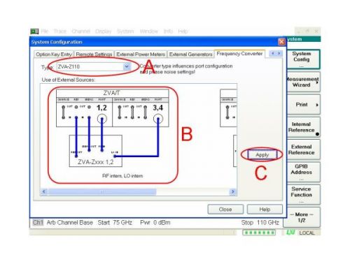 在圖2所示的A、B、C三個區域進行如下測量配置:在A區擇變頻模塊型號,在B區選擇電纜連接方式,在C區點擊應用按鍵并連接變頻模塊到網絡分析儀(見圖 3),然后將頻率軸調節成75GHz到110GHz(見圖2底部)此外,變頻模塊的所有測量參數會被自動設置(例如射頻和本振的倍頻系數、最佳功率電平、復位設置、連接類型WR10,以及定義和選擇波導校準套件R&S ZV-WR10)