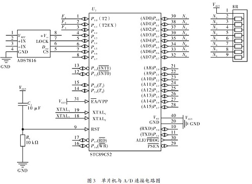 因為Pt100是模擬溫度傳感器,且溫度測量范圍廣,所以設計采用ADS7816,A/D電路圖如圖3所示。管腳VREF接橋式測溫電路的基準電壓,管腳+IN信號數據輸入口接INA126運放的輸出端,-IN、GND管腳分別接地。管腳CS片選端接單片機的P1.6口,低電平有效,當P1.6口置低電平時A/D選通,開始工作。管腳Dout信號數據輸出口接單片機的P1.5口,用于讀取A/D轉換后的數據。管腳LOCK時鐘信號口接單片機的P1.4口,單片機P1.4口提供A/D連續時鐘脈沖,保證A/D數據轉換和讀取的正常。管腳VCC接經LM1117穩定后的輸出電壓3.3 V。設計采用STC公司的89C52單片機作為核心,在系統中用89C52單片機來讀取A/D轉換數據并處理,然后控制液晶顯示,是設計中所有器件的核心模塊。
