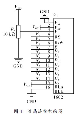 基于液晶1602顯示內容豐富,功耗低等優點,選用液晶1602作為顯示模塊。液晶的第1管腳是接地管腳,管腳VCC接電源,液晶的管腳VL外接電源串聯一個10 kΩ的電位器后接地,用來調節液晶的亮度對比度,使其顯示清楚、準確。管腳RS接單片機的P1.0口。管腳RW接單片機P1.1。管腳EN接單片機P1.2口,是液晶的使能管腳。液晶的數據口(7~14管腳)接單片機的P0.0~P0.7口,液晶的數據口采用8位并口方式進行數據傳送。第15,16管腳是液晶背光燈的正負極,分別接VCC和GND即可。液晶連接電路圖如圖4所示。