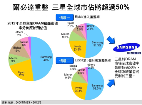DIGITIMES Research分析師柴煥欣分析,受DRAM價(jià)格自2011年第1季持續(xù)性下滑影響,加上日圓匯率亦持續(xù)升值加重成本負(fù)擔(dān),全球第3大DRAM供貨商爾必達(dá)(Elpida)在歷經(jīng)連續(xù)5季虧損后,終于無法支撐,于2012年2月27日無預(yù)警申請破產(chǎn)保護(hù),并將進(jìn)行重整。
