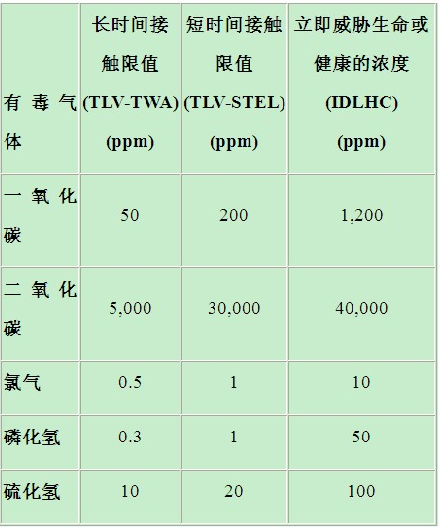 在美國,國家職業安全與健康研究所(NIOSH)和美國政府工業衛生學家會議(ACGIH)已規定了許多有毒工業氣體的短時間和長時間接觸限值。"閾限值-時間加權平均值"(TLV-TWA)是指大多數工人可以在正常8小時工作日內反復接觸而不會受到有害影響的時間加權平均濃度。"閾限值-短時間接觸限值"(TLV-STEL)是指大多數工人可以短時間接觸而不會受到刺激或傷害的濃度。"立即威脅生命或健康的濃度"(IDLHC)是一種限制性濃度,它會對生命立即或緩慢產生威脅,導致不可逆轉的健康損害,或者影響工人獨立逃生的能力。表1列出了幾種常見氣體的限值。