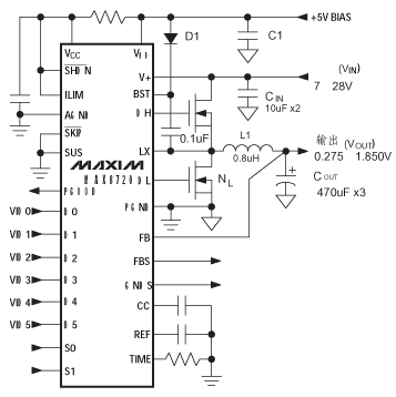 由MAX8720組成的降壓式DC/DC轉換器電路如圖6所示。現使用條件為VIN=7~24V、VOUT=1.25V、IOUT(max)=15A、fsw=300kHz,控制器的工作電壓(偏置電壓)VCC=5V,選合適的開關管(NH)及同步整流管(NL)。