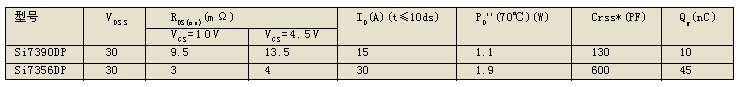 初選Vishay公司的Si7390DP作NH(其Qg僅10nC);Si7356DP作NL (RDS(on)=4mΩ)。其封裝都是8引腳、有散熱墊的SO-8封裝,主要參數如表3所示。