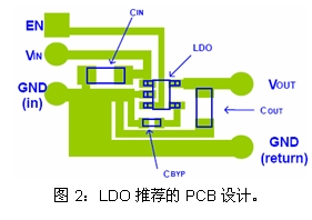 如在TCXO(溫度補償晶振)電源中,其只需要5mA的負載電流,Vout固定,若能控制Vin的值僅稍大于Vout+Vdrop,(一般地,CMOS LDO的Vdrop在Iout=5mA條件下,其值為5mV~10mV),則LDO的自身功耗Pd在不到1mW,這取決于方案設計工程師在應用電路中的設計。