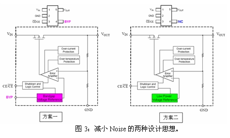 方案一中,如不加bypass電容,CMOS LDO的噪聲一般在200~450uVrms(沒有負載時的電源電流越小,這個噪聲越大),加了這個電容濾波后,LDO的噪聲一般為30~50 uVrms,因此方案一的低噪聲CMOS LDO都是有這個Bypass腳,并且是必須加這個濾波電容才能做到低噪聲。