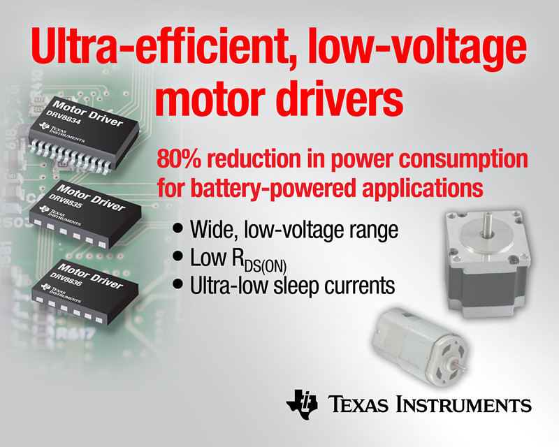 日前,德州儀器 (TI) 宣布推出 3 款面向有刷 DC 及步進電機的最新低電壓器件,進一步壯大其不斷豐富的高集成 DRV8x 電機驅動器產品陣營。該 DRV8834、DRV8835 以及 DRV8836 電機驅動器支持寬泛的低電壓工作范圍、低 RDS(ON) 與超低睡眠狀態電流,與性能最接近的競爭產品相比,功耗銳降達 80%,可延長電池使用壽命,改進散熱性能,提高系統可靠性。此外,這些高集成器件還采用超小型封裝,與分立式解決方案相比,可將板級空間銳減達 95%。