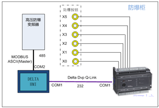 該系統(tǒng)主要配置包括ES2R控制器 1 臺(tái),B05S100觸摸屏1臺(tái),高壓防爆變頻器1臺(tái),6枚按鈕防爆。整個(gè)系統(tǒng)中,除6枚防爆按鈕安裝在防爆柜面板外,其余部分都封閉于防爆柜體內(nèi),變頻器所有操作通過(guò)6枚按鈕完成。因?yàn)樘幱诜辣h(huán)境中,不能直接操作接觸摸屏,所以要通過(guò)PLC的6個(gè)輸入點(diǎn)外接防爆按鈕來(lái)代替在觸摸屏上的操作。該方案的靈活之處就是避免了操作人員直接觸摸屏,從而防止事故發(fā)生。
