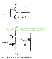 圖1(a)為常用的小功率驅(qū)動(dòng)電路,簡單可靠成本低。適用于不要求隔離的小功率開關(guān)設(shè)備。圖1(b)所示驅(qū)動(dòng)電路開關(guān)速度很快,驅(qū)動(dòng)能力強(qiáng),為防止倆個(gè)MOSFET管直通,通常串接一個(gè)0.5~1Ω小電阻用于限流,該電路適用于不要求隔離的中功率開關(guān)設(shè)備。這兩種電路結(jié)構(gòu)特簡單。