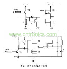 功率MOSFET屬于電壓型控制器件,只要柵極和源極之間施加的電壓超過其閾值電壓就會(huì)導(dǎo)通。由于MOSFET存在結(jié)電容,關(guān)斷時(shí)其漏源兩端電壓的突然上升將會(huì)通過結(jié)電容在柵源兩端產(chǎn)生干擾電壓。常用的互補(bǔ)驅(qū)動(dòng)電路的關(guān)斷回路阻抗小,關(guān)斷速度較快,但它不能提供負(fù)壓,故其抗干擾性較差。為了提高電路的抗干擾性,可在此種驅(qū)動(dòng)電路的基礎(chǔ)上增加一級(jí)由V1、V2、R組成的電路,產(chǎn)生一個(gè)負(fù)壓,電路原理圖如圖2(a)所示。