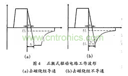 電路原理圖如圖3(a)所示,N3為去磁繞組,S2為所驅(qū)動(dòng)的功率管。R2為防止功率管柵極、源極端電壓振蕩的一個(gè)阻尼電阻。因變壓器漏感較小,且從速度方面考慮,一般R2較小,故在分析中忽略不計(jì)。其工作波形分為兩種情況,一種為去磁繞組導(dǎo)通的情況,見圖4(a);一種為去磁繞組不導(dǎo)通的情況,見圖4(b)。