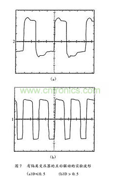 6(b)為占空比大于0.5時(shí)適用的驅(qū)動(dòng)電路,其中Z2為穩(wěn)壓二極管,此時(shí)副邊繞組負(fù)電壓值較大,Z2的穩(wěn)壓值為所需的負(fù)向電壓值,超過部分電壓降在電容C2上,其實(shí)驗(yàn)波形見圖7(b)。