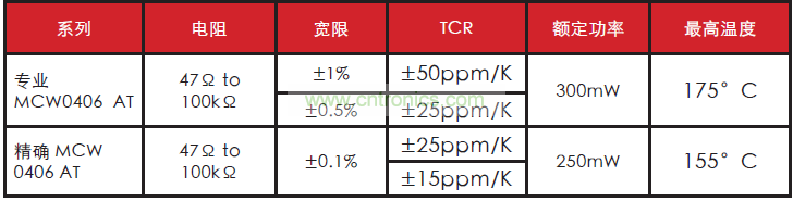 為了提高穩定性,不論應用場合是需要全功率能力還是只需要一小部分標稱額定功耗,這些電阻都是同樣有效的。電阻有兩種型號。MCW 0406 AT 專業系列設備額定功耗高達 300mW,高溫性能達到 175°C。
