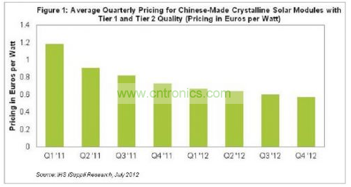 預(yù)計(jì)下半年晶體太陽(yáng)能模組的平均市場(chǎng)價(jià)格仍將下跌11%,但跌幅略小于上半年的12%,并遠(yuǎn)小于2011年下半年的20%。預(yù)計(jì)2012年第四季度平均市場(chǎng)價(jià)格將從第二季度的每瓦0.64歐元跌至0.57歐元。模組通常以歐元計(jì)價(jià),而硅則以美元計(jì)價(jià)。