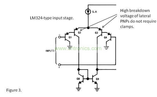 使用橫向PNP 輸入晶體管的通用運算放大器一般沒有輸入鉗位,例如:LM324" target="_blank" title="Link to Product Folder">LM324、LM358" target="_blank" title="Link to Product Folder">LM358、OPA234" target="_blank" title="Link to Product Folder">OPA234、OPA2251" target="_blank" title="Link to Product Folder">OPA2251 和OPA244" target="_blank" title="Link to Product Folder">OPA244。這些運算放大器一般為“單電源”類型,其意味著它們擁有一個擴展至負電源端(或者稍低)的共模范圍。輸入偏置電流為一個負數時,表示輸入偏置電流自輸入引腳流出。這時,我們通??梢哉J定它們為這類運算放大器。但是,需要注意的是,使用PNP 輸入的高速運算放大器一般有輸入鉗位,而這些PNP 是一些具有更低擊穿電壓的垂直PNP。