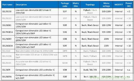 圖1  NXP中小功率市電供電非調(diào)光LED驅(qū)動(dòng)IC選型表格