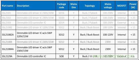 圖2  NXP中小功率市電供電可控硅調(diào)光LED驅(qū)動(dòng)IC選型表格