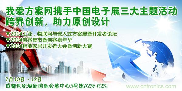 【導讀】我愛方案網和CNT Networks攜手中國電子展主辦的“2014工業、物聯網和嵌入式設計方案展暨中國西部電子開發者與創客論壇”即將于2014年7月10日-12日在成都開幕。同期同地,我愛方案網還將舉辦2014創客集市暨創客嘉年華活動,以及與千家網合辦2014智能家居開發者論壇暨創新大賽(成都)。