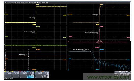 圖1:先將快速邊沿測試信號加到濾波器的輸入端(左上),然后用濾波器輸出(右上曲線)對它進行微分(右中),最后求FFT的平均值(下右),就可以得到濾波器的頻率響應。左下邊曲線中的頻譜展示了微分過的階躍輸入信號的頻率平坦度。