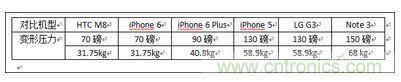 此外,美國(guó)《消費(fèi)者報(bào)告》利用三點(diǎn)式測(cè)試方案,將iPhone 5、iPhone 6、iPhone 6 Plus、HTC M8、LG G3以及三星Note 3手機(jī)懸空固定,并對(duì)機(jī)身中間部位施加壓力,計(jì)算上述手機(jī)變彎時(shí)所能承受的壓力上限。結(jié)果顯示(見表),iPhone 6/Plus和HTC M8的承受壓力最低(圖4),在受力達(dá)31kg左右時(shí)就會(huì)被壓彎,而表現(xiàn)最好的是Note 3,在68kg壓力時(shí)“防線”才會(huì)崩潰。